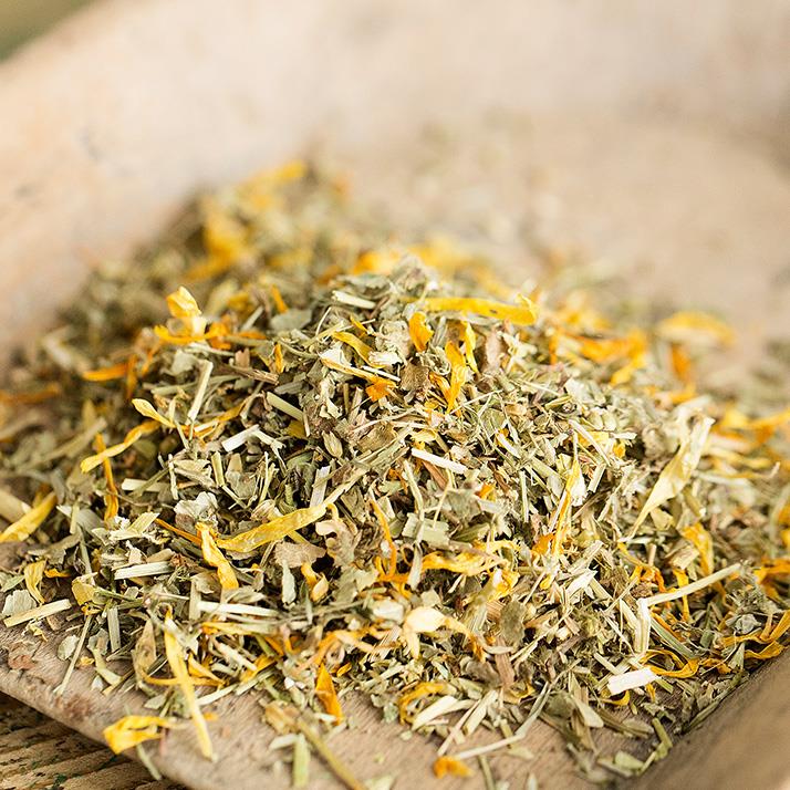 Kräutermischung mit Melisse, Frauenmantel, Eisenkraut, grünem Hafer, Ringelblume, Apfelstücken